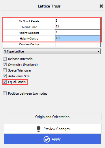 As our truss has varying height, we now change the Height-Support to 1 m and the Height-Centre to 1.4 m.