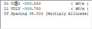 Pick the upper of the two loads to set the cursor focus to it and change the load to D1 UDLY -000.250 (kN/m) by overtyping the - 000.000 value.