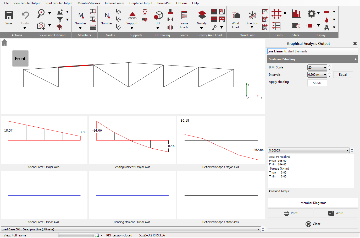 This displays all the diagrams for the current loading case of the current member on a single screen, together with the torque and axial local values.