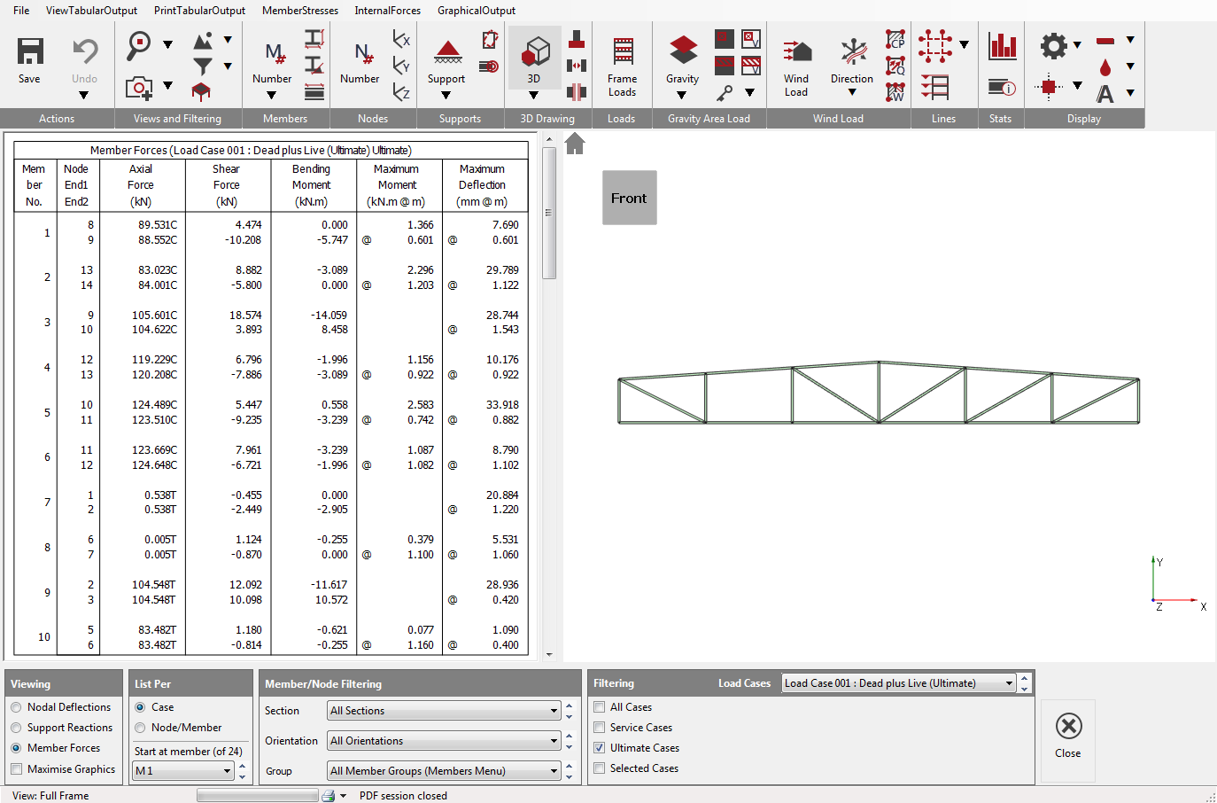 The standard method of viewing results is List per Case. This only display results in one loading case at a time. The other method is to List per Node/Member. This is useful to compare results for different loading cases for the same node or member as shown here.