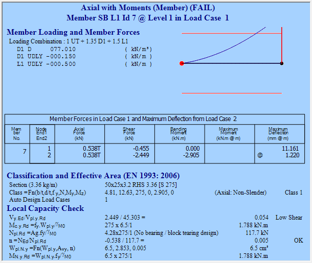 The above results indicate that some members are under-sized. We will use the Axially Loaded Members with Moments check to select suitable sections.