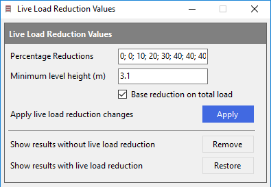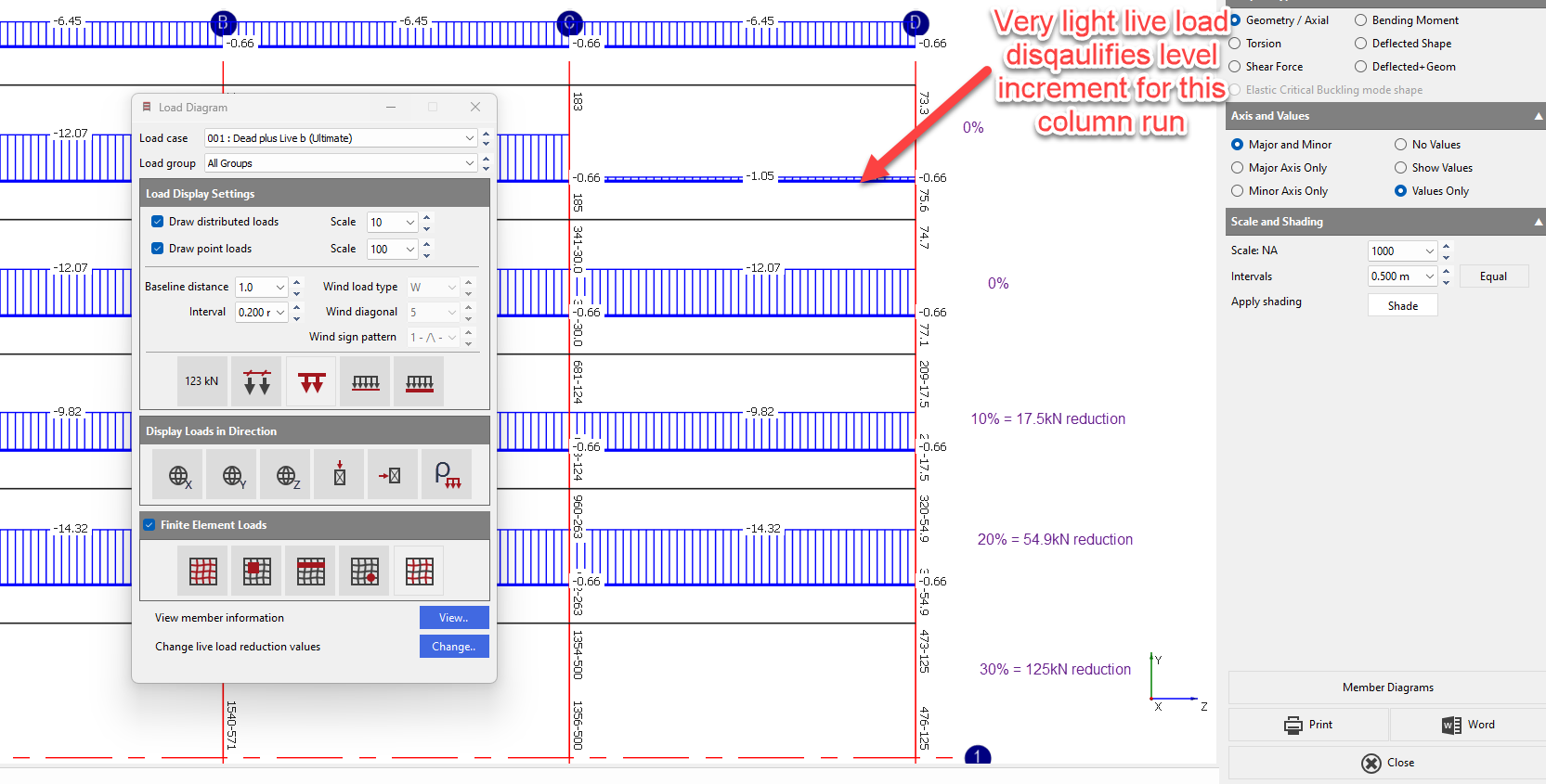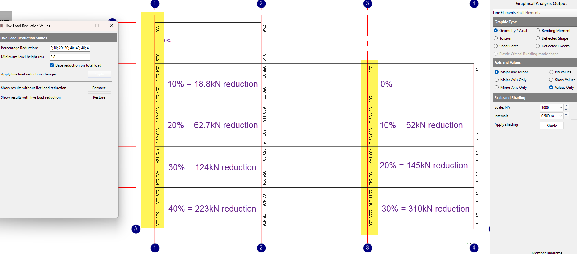 - While viewing the axial force as described above the ‘Show results without live load reduction’ Remove button can be used to hide the force reduction values and can be redisplayed using the Restore button