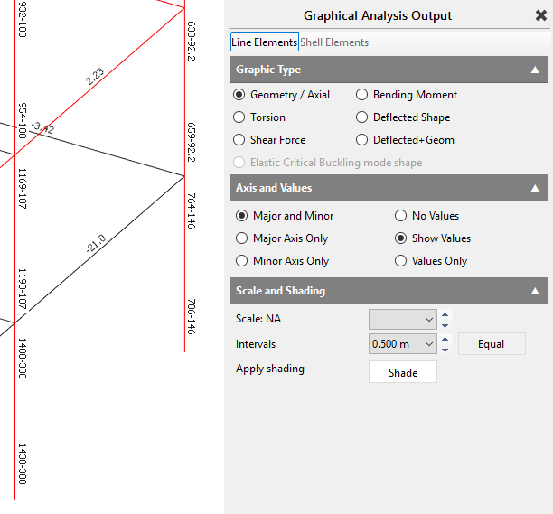 - Check the ‘Show Values’ option to display the axial force value on the members in the frame geometry area. The axial force in the columns that are subject to live load reduction are shown with the full axial force minus the reduction force, eg, 768 – 146 kN where 146 kN represents the reduction force.