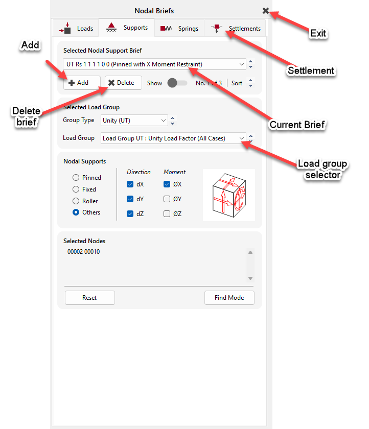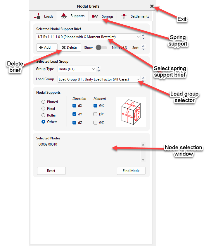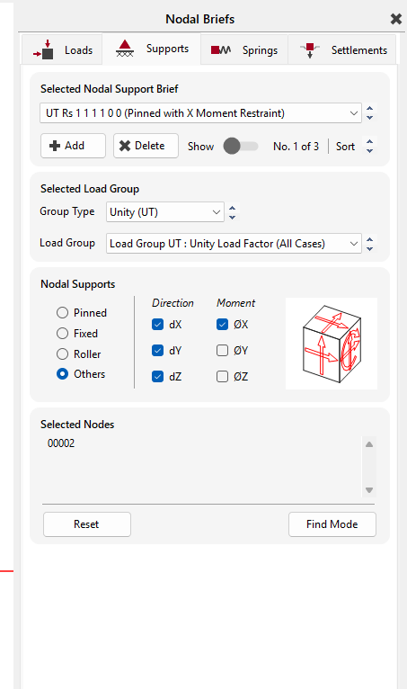 Each of the Nodal Static Support, Nodal Spring Support and Nodal Support Settlements functions open a common interface, where each type of nodal support can be accessed, defined and applied to the model. For each support type, different types of restraint can be defined to give different support conditions, to be applied either to different nodes, or, supports can be defined to apply to particular loadcases. so, it is possible to have different support conditions apply to the same node, with the support type determined per loadcase.