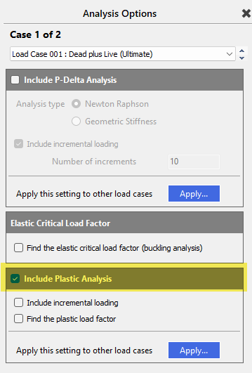 The use of the plastic analysis option means that within the analysis, the software will calculate the formation of plastic hinges at predefined locations. In order for the load case to include plastic analysis this must be turned on for the loading case from 'Analysis> Second Order Analysis Option per case'