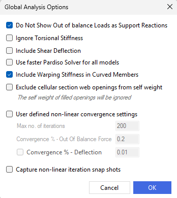 The Global Analysis Options provides control over features of the analysis of a model which apply to the model in its entirety. These are distinct from options which apply on a member-by-member or loadcase-by-loadcase basis.