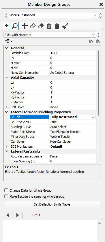 a)Axial with Moments (📄 Axial Loaded Members with Moments design brief) – ideal for beams and columns with moments, shear and axial loads applied. The effective length ratio can be defined, nominal moments switched on, deflection limits, min and max depth parameters and portion lengths between lateral restraints, etc applied. These will be used in the design of this particular group of members.