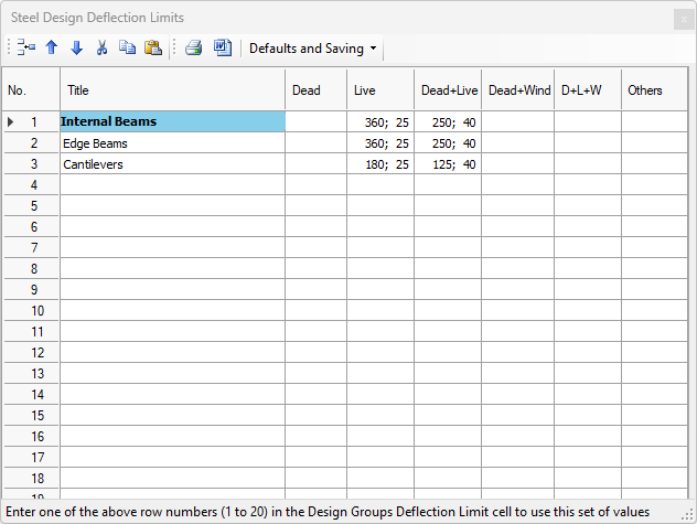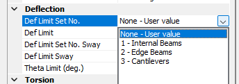 Deflection limit sets can be viewed and edit here using the 'Set Defelction Limits Table' button. They can also be edited in the steel and composite design areas. Deflection limit sets allow different “span over” and absolute mm defelction values to be used for different combinations of serviceability cases. For example, entering “360; 25” in row two under the Live column means that for deflection limit pattern number 2, live load only deflections will be checked against span/360 and also against an absolute deflection of 25.0 mm.