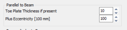 For the eccentricity parallel to the beam, where the beam connects to the web of an I section column, specifying a toe plate thickness assumes the beam is connected to a plate across the flange toes, and not into the web, hence adjusting the eccentricity from tw/2 to B/2 +Toe plate thickness. The default accepted standard additional nominal 100mm can also be adjusted ( a zero value will assume the default of 100).