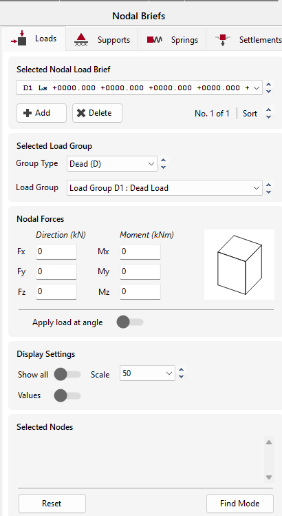 To apply another set of loads you must first select Add button, click Reset to clear the current list of selected nodes if necessary. Then define the new node list, the load values and the load group.