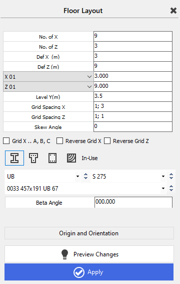 It starts with 9 bays in the X direction and 3 bays in the Z direction, with the X spacing defined as 3m and the Z spacing as 9m. If you drop the down arrow next to the X 01 line you will display all the X bay spacings, which can then be altered where required so that all spacings can vary in the X direction. The same can be achieved for the Z spacings.