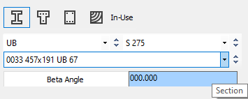 You can select the type and size of basic section that you want to start the frame off with. These can be steel, T-shaped concrete, rectangular concrete or rectangular timber. The orientation (beta angle) of the members can be defined. They will normally sit at 0 degrees, major axis vertical.