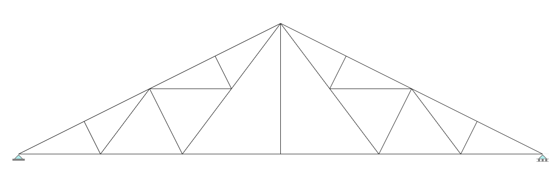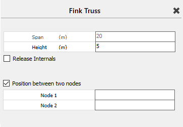 The Fink truss can be set up easily by entering the span and max height of the truss. Usually, you would also release the internals so they only take axial loads. The truss can also be placed in an existing frame between 2 specified nodes.