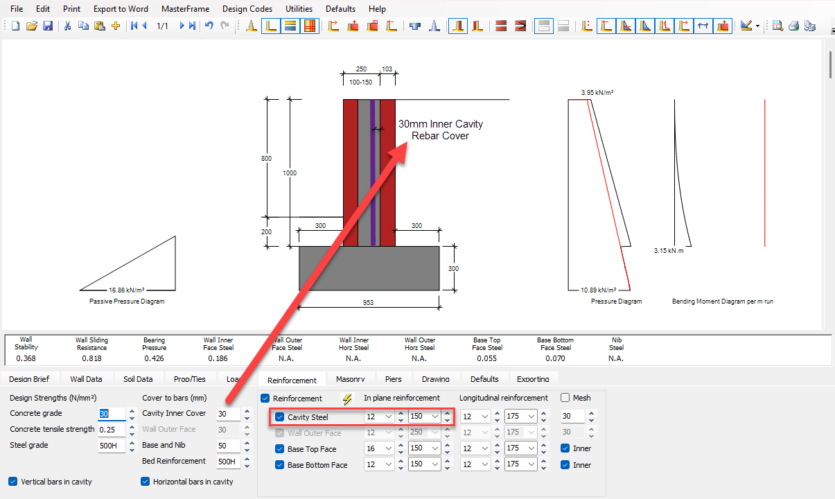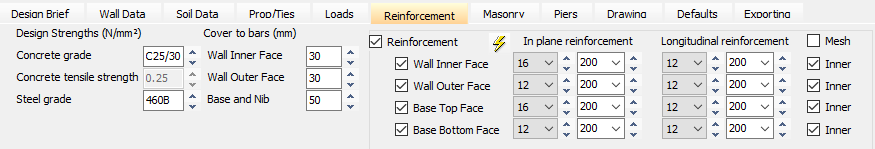 In the reinforcement area the bar sizes and spacings are set for the 4 faces of the wall and base, for both the in-plane and longitudinal reinforcement.