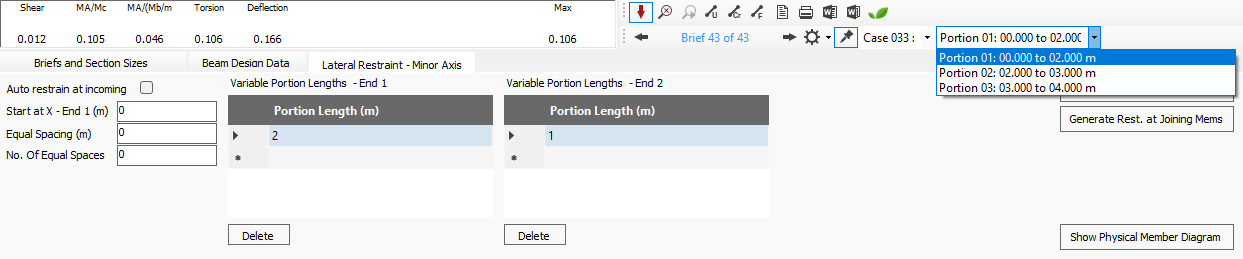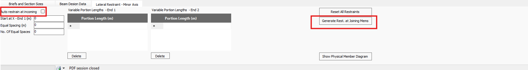 The Generate Restraint at Joining Mems option will automatically input the Portion lengths in the End 1 grid. This means that the position of the restraints can be amended manually. When the "Auto Restrain at incoming" check box is selected, the Portion input and the Generate Restraint at Joining Members options are disabled. Any amendments to the position of the incoming members in the Masterframe model will then be automatically accounted for in the design brief on the amended members.