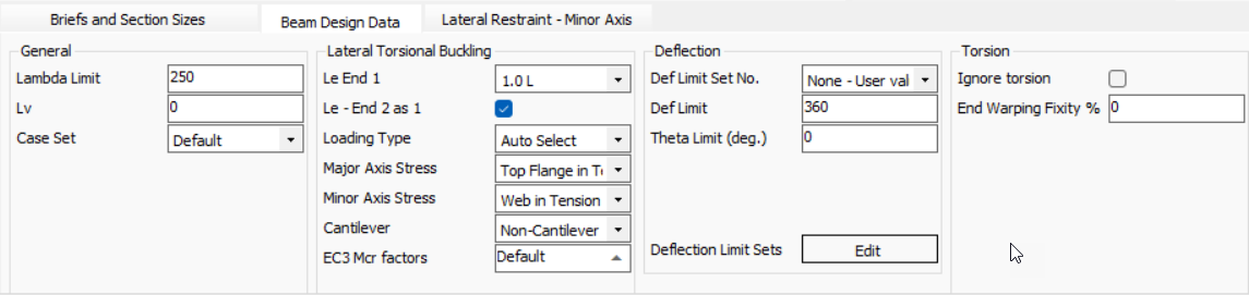 The lateral restraints tab provides inputs which control the restraints to the member for use in the lateral torsional bending design checks. The lateral restraints only restrain the minor axis in bending.