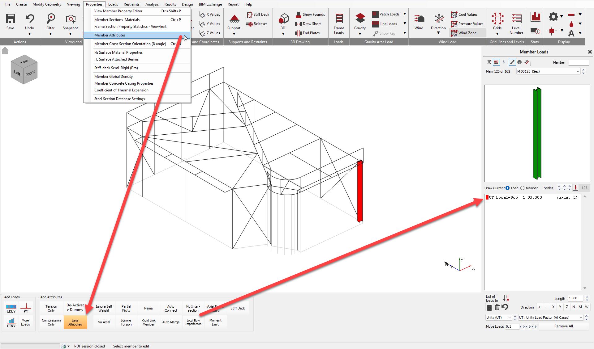 If local bow loads are required for both axes, you must apply two separate Local-Bow member attributes to the member, one for each axis. In this case it is not necessary to apply the local bow imperfection load to both axis simultaneously, hence the 'UT' load group (global common) should not be used, and each axis local-bow load group should be separated. E.g.
