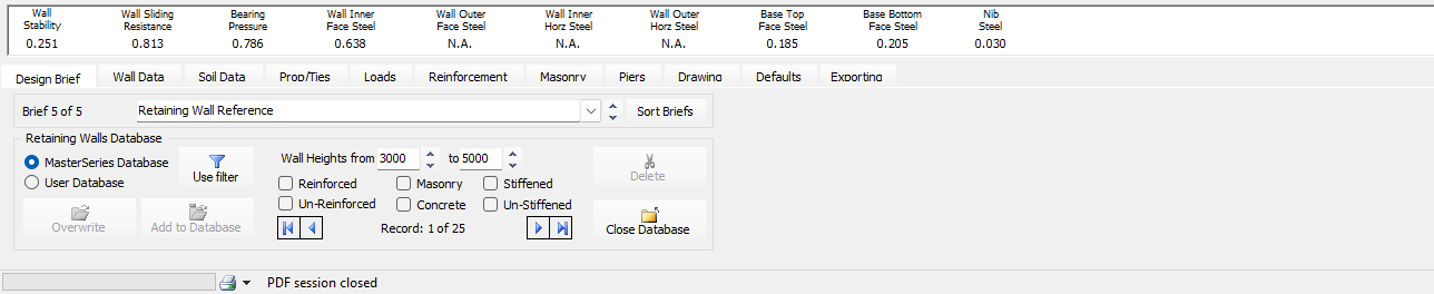 Use the editing area to select "add a brief from the database". The database contains standard templates, including those specifically for the Stepoc retaining wall. Selecting this template sets up the initial specifications automatically. Refer 📄 Reinforced Hollow Block Retaining Walls to know more about downloading and using the defined briefs