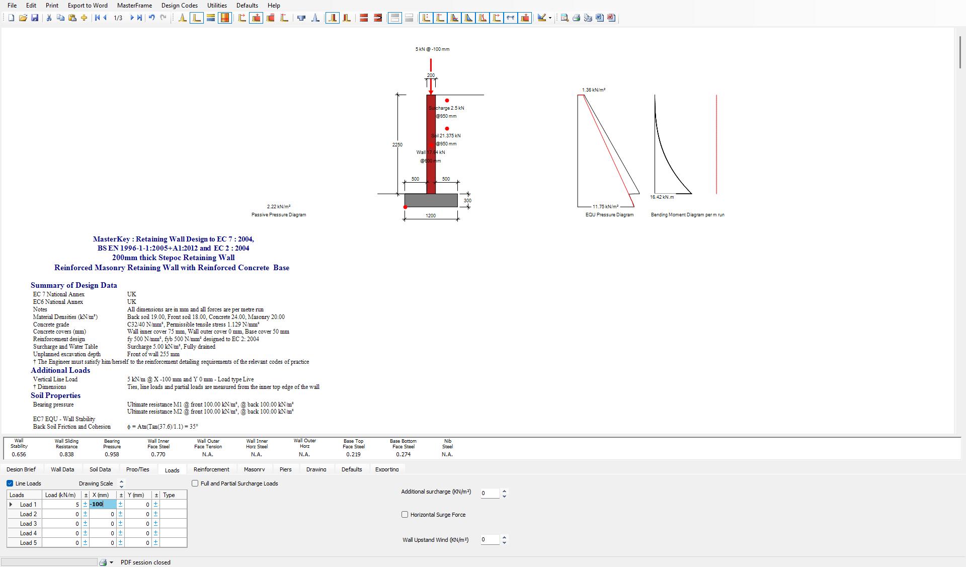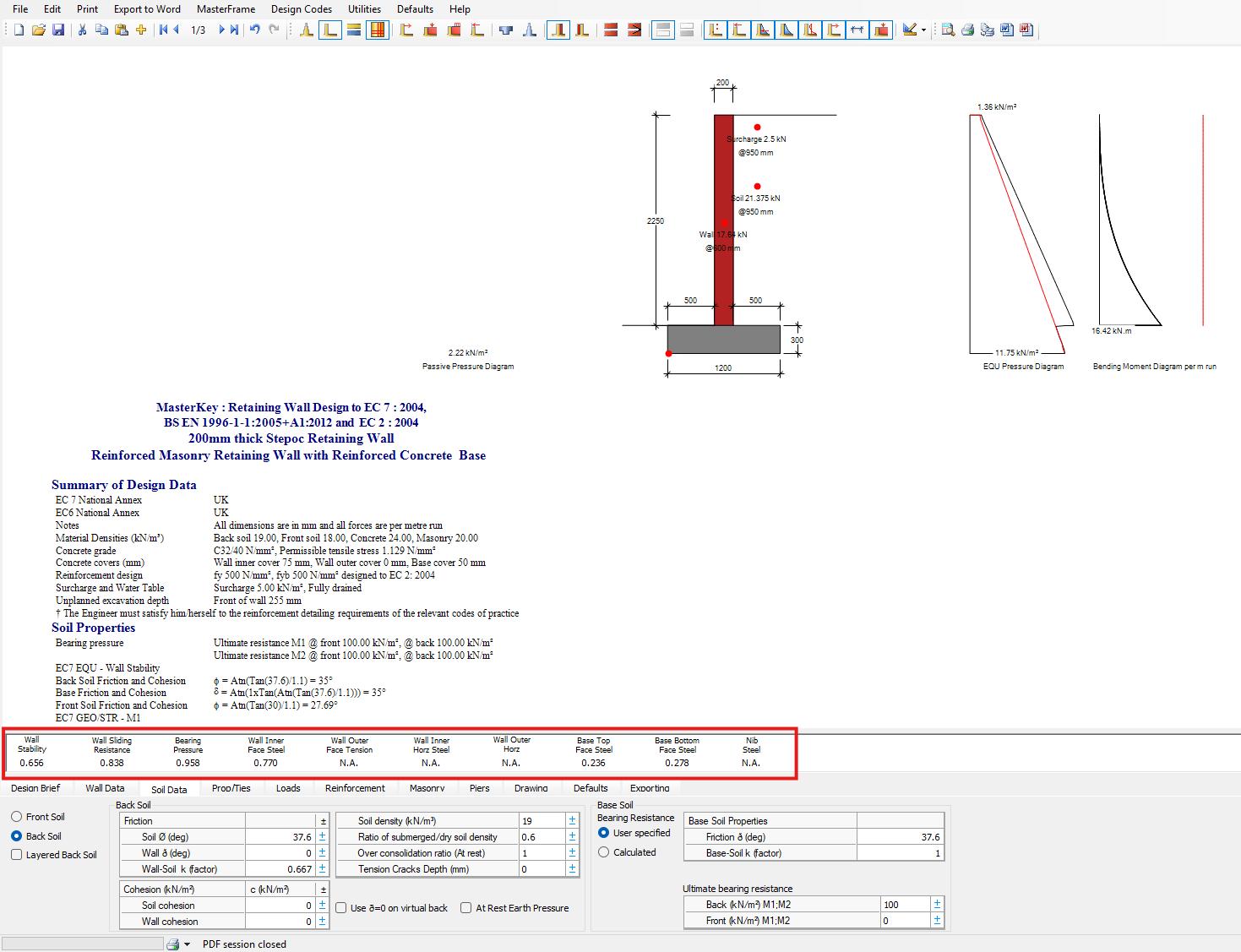 - The MasterSeries graphic screen provides a summary of calculations, including geotechnical design checks (overturning, sliding, bearing) and structural integrity checks (bending moments, shear).