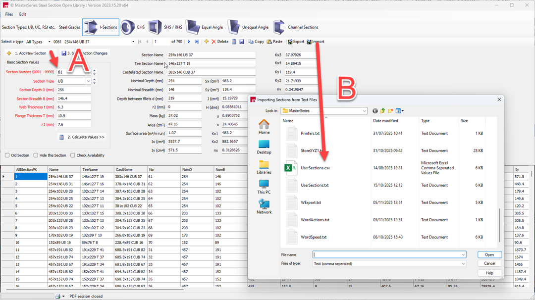Once the sections are added to the Open Library, they are permanently available on the local computer. You can access and utilise these new standard sections within MasterFrame: