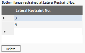 - Lateral Restraint No.: Flange restraint to the opposite flange i.e. stays. This input is not a distance but the lateral restraint number as annotated in the design output. This is 'other side' flange restrain is coincident with the lateral restraint.