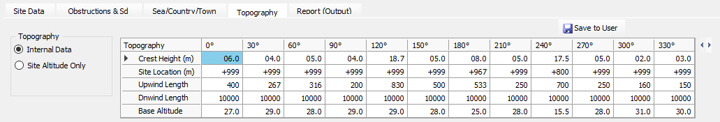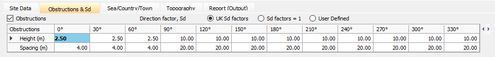 If there are obstructions in the vicinity of the structure being examined, these can be taken into account by specifying the height of and distance to the obstructions at intervals of 30 degrees around the building. These are normally automatically entered from the in-built database, but can be overridden if desired.