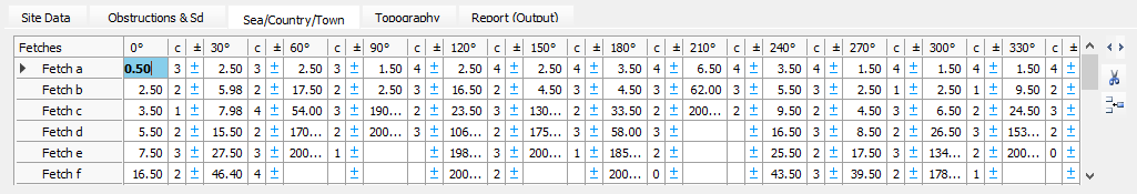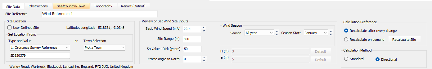 Fetch distances and category types are automatically included when a site is selected from the Great Britain/Ireland map. For a site outside Great Britain/Ireland, the values can be entered manually for each orientation.