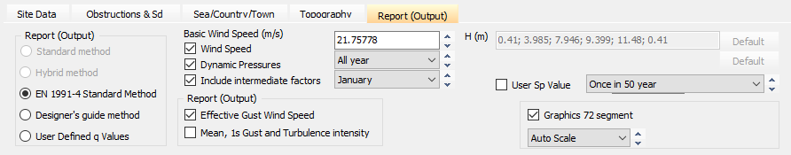 On the Report (Output) tab, the user can select which method to employ for the calculation of the wind loads – Standard, Hybrid, Directional or Designer’s Guide. Having settled on the appropriate method, the screen and printing output options can be selected. The basic wind speed automatically selected from the map may be changed if desired, as can the start and length of the season under consideration. Building floor levels and wind diagonal lengths can be changed from the defaults if necessary (note – when used in conjunction with MasterFrame (Pro), these values are automatically taken from the model). Select the risk period from the droplist. Finally the graphics scale and number of segments can be varied. The wind pressure diagram can be viewed for each wind diagonal length a, if applicable