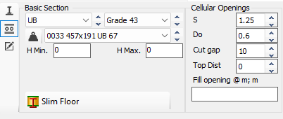 The cells can be specified as the diameter of the opening (Do) and the spacing (S) and can be entered either in mm or as a ratio of the beam depth. For example, Do could be entered as 0.6 times the beam depth. The spacing is then entered as a multiple of the Do ratio, say 1.8. For a 356 UB, the opening diameter Do would be 0.6x356 = 215mm and the spacing S would be 1.8x215 = 385mm (rounded down from 387mm).