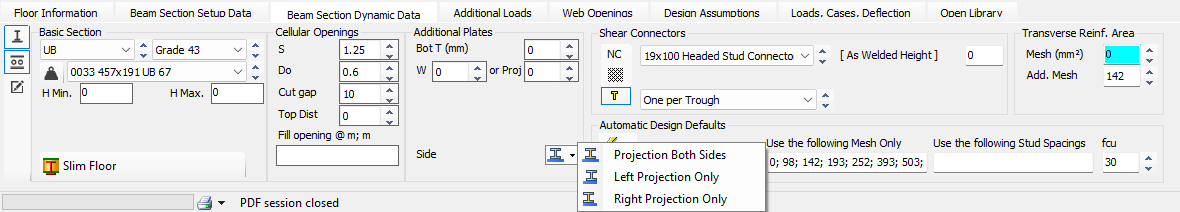In addition to profiled decking or precast slabs being placed on the top flange of a beam you can design slim floor construction beams where a deeper decking is placed on the bottom flange of a beam. A normal UB or UC section can be chosen from the droplist of sections and an extended plate added to the bottom flange if required, on which the deeper profile decking will sit. There are also a list of Asymmetrical SlimFloor Beams (ASBs) available from the sections droplist to accommodate the slim floor construction.