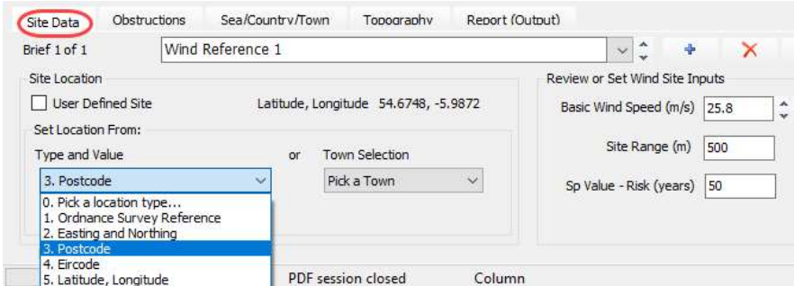 Site Data Input site location options – you can input the site location as an Ordnance Survey Reference, a UK Easting and Northing, and IRL Easting and Northing, a UK postcode, an Irish eircode or as Latitude and Longitude. A useful website is the Grid Reference Finder app which will give the various location input options for any particular site.