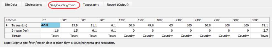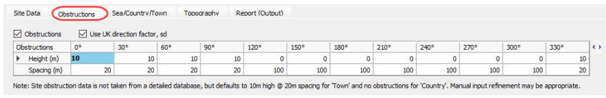 Height and spacing of obstructions are per each 30 degree angle – note:- site obstruction data is not taken from a detailed database (the site data doesn’t contain individual data for every building, but for a general area), it defaults to 10m high buildings at 20m spacing for ‘Town’ and no obstructions for ‘Country’. Therefore a manual input refinement may be appropriate where required.