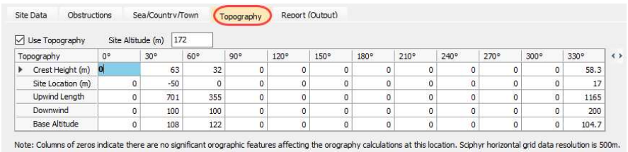 The 500m range is a radius – cross sections across the topography are taken in various directions to ascertain the ground cross sections and what is upwind and downwind and what angles the ground rises and falls by. Only certain conditions will trigger a set of data. Some slopes will be too shallow to register and so zeros are input in Sciphyr whereas BREVe would have included the data even though it wasn’t relevant.