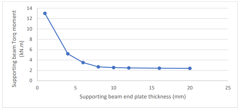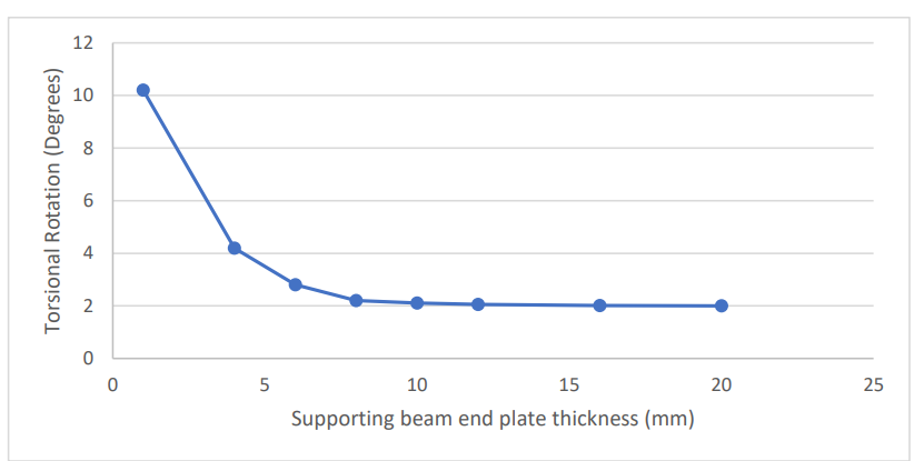 In this example an end plate thickness of 8mm was adequate for the connection to act as a rigid moment connection. At this point, the supporting beam rotation and torq moment was reduced to a minimum, and the moment at the end plate interface approached that of Mtoe,Ed, which was 30 kN.m. Even though this would be considered an acceptable full depth flexible end plate (<= 10mm), it provided adequate stiffness in this example to provide torsional restraint to the supporting beam. This is primarily due to the torsional stiffness of the supporting beam being small relative to the connection stiffness. It must be emphasised that this just is one example and not a parametric study.