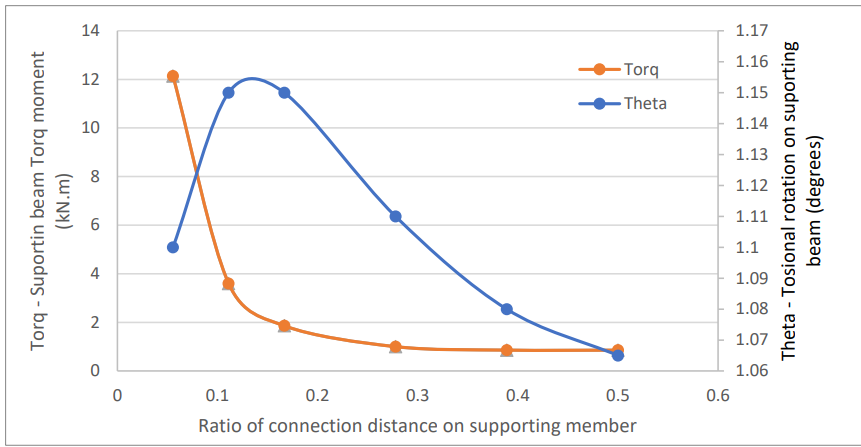Figure 5 – Effect of position of supporting supported beam along supporting beam on supporting beam torq moment and torsional rotation.