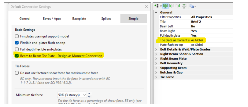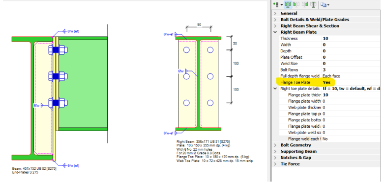 Due to popular demand and in keeping up to date with industry practices, Toe Plate Connections are now an option within MasterSeries Steel Connection Design, for Simple Beam to Beam Flexible End Plate Connection Design.