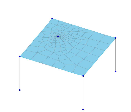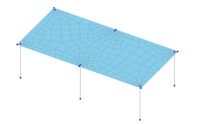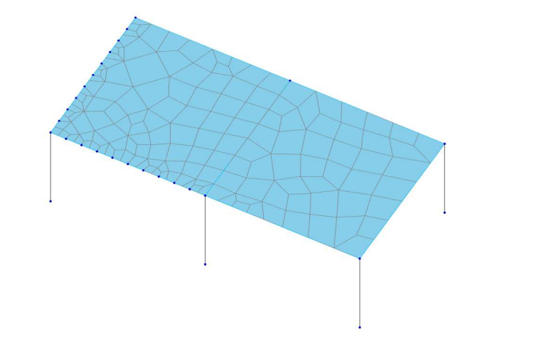 The finite elements remain 4-sided in shape. A typical example of a valid mesh is shown below. The example is made up of two FE surfaces with a common boundary at the middle of the slab. The FE mesh is automatically generated by the software using a meshing algorithm which attempts to form a mesh which complies with the above requirements.