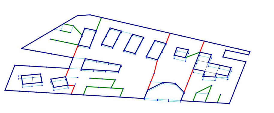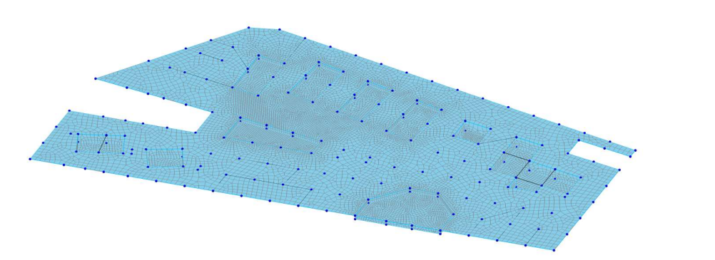 When FE surfaces are representing large structural elements, for example large area floor slabs, particularly when the FE surface has a large number of constraints from other structural elements or geometry, the issues encountered in meshing can be due to the difficulty of forming a mesh in the large FE surface itself. This is more likely when the FE surface has edges that are not parallel or has a lot of internal constraints which are not parallel to the boundary, requiring the mesh to align in different orientations at different constraints.