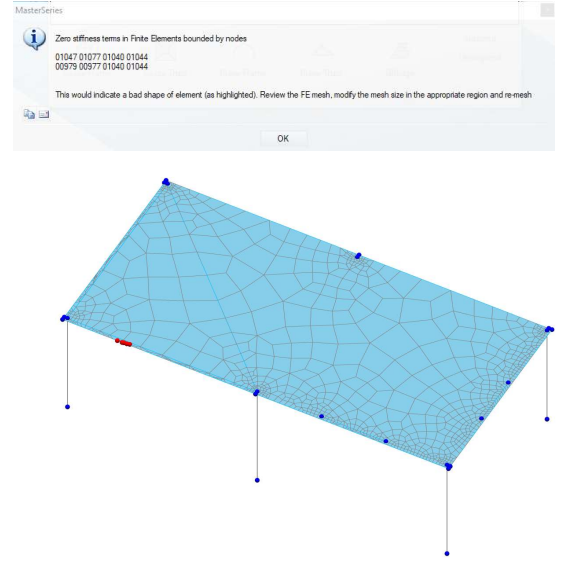 An example of a Zero stiffness warning message and highlighted nodes is shown below