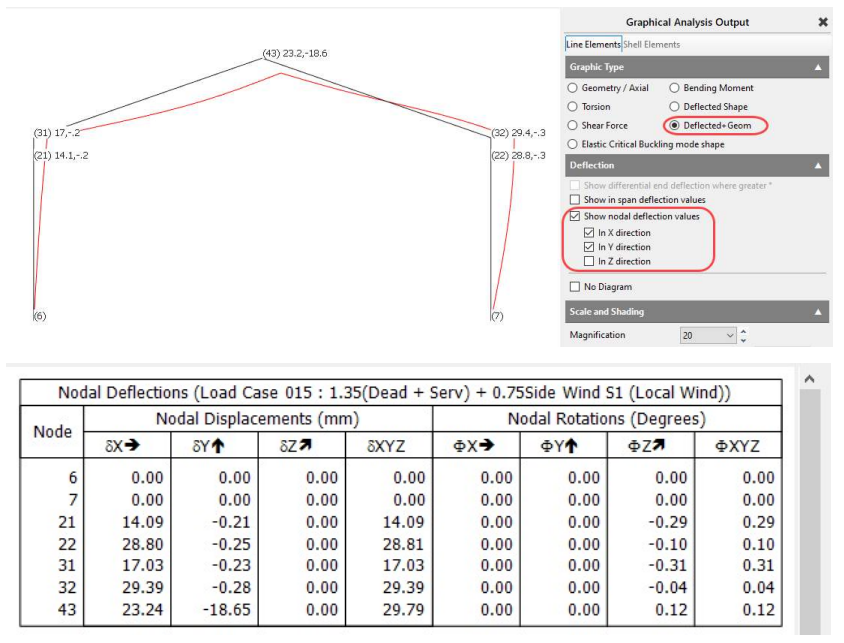 Nodal Deflections The nodal deflections after analysis are the displacements of the nodes from their original positions prior to any loading being applied. As loading is applied the frame will deflect and the nodes will move. These nodal deflections can be displayed in the output graphics and in tabular format as shown below.