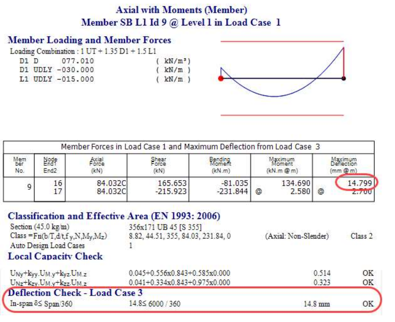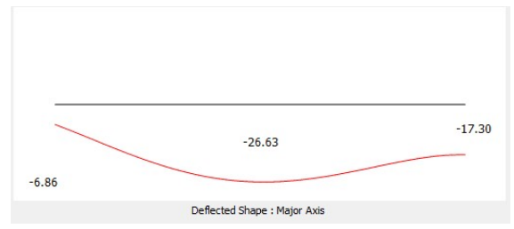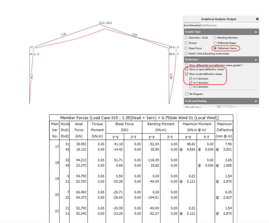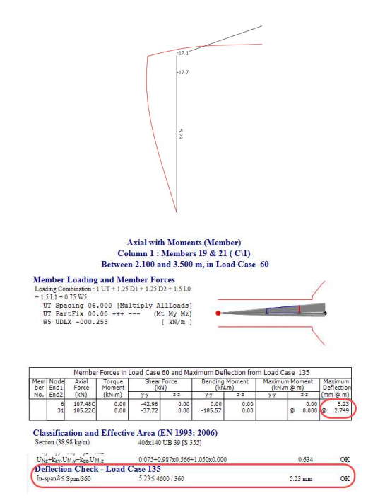Similarly for a portal column leg, the steel design deflection check is for the deflection of the member due to its bending curvature as opposed to the max displacement of the node at its top, in this case 5.23mm in-span deflection and not the 17.1mm at its head.