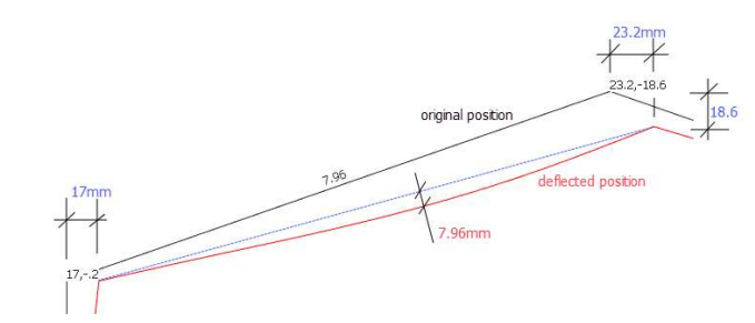 The portal frame has moved sideways and downwards under dead and live and side wind loading. The ends of the rafter have displaced by the amounts shown in blue. However, the rafter itself has only deflected 7.96mm from a straight line connecting its two ends. Similarly for the portal leg below where the column has deflected 5.23mm due to bending curvature.